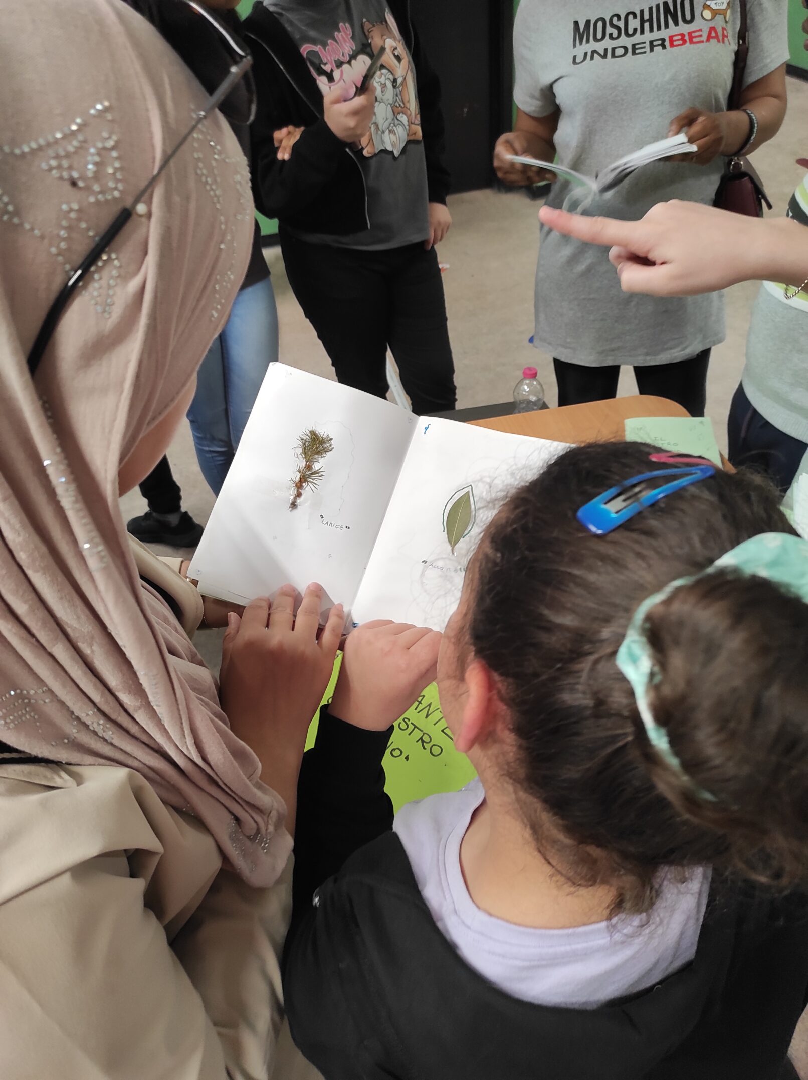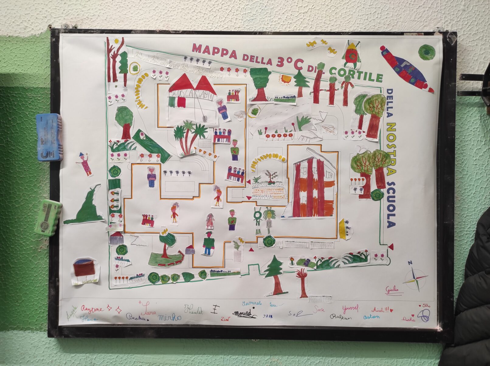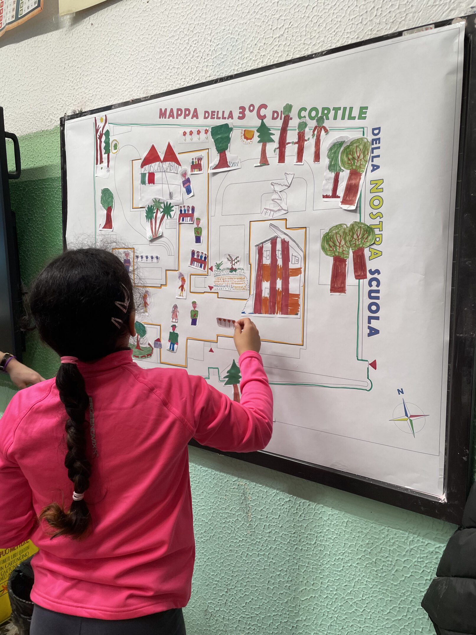 La prima tappa svolta nel 2024 ha coinvolto una classe e ha previsto una fase di conoscenza del proprio cortile scolastico, con la realizzazione della mappa del cortile. Con i laboratori di agronomia insieme a Giacomo Toppi i bambini hanno scoperto e analizzato le diverse specie arboree del cortile, e hanno realizzato l’erbario personale e quello collettivo della classe.