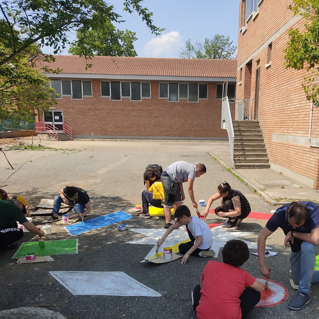 La seconda fase di laboratori partecipativi è stata proposta in primavera 2022: un laboratorio di giardinaggio per avvicinare i ragazzi alla cura del loro cortile, e uno di urbanismo tattico, per realizzare insieme agli studenti i disegni a terra.